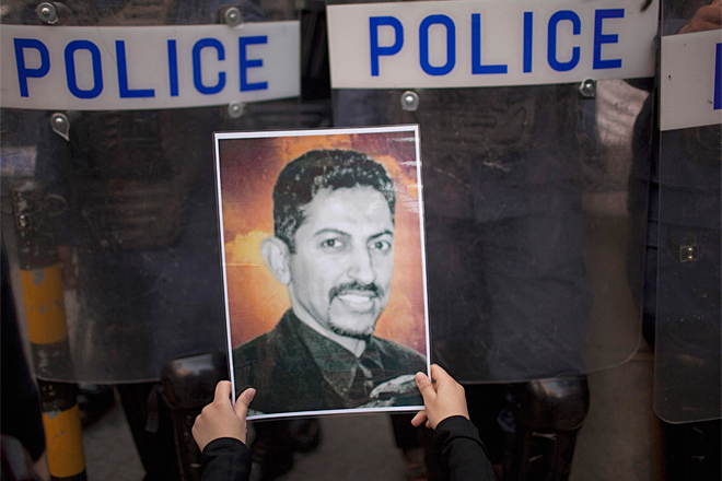 In the years thereafter, Al-Khawaja was regularly subjected to further arrests, physical harassment and smear campaigns (though vociferous local and international support generally led to his early release). In the wake of the Arab Spring in early 2011, the regime’s on-again/off-again tolerance for Al-Khawaja’s increasingly effective activism came to a complete end. Following the March 14 suppression of the short-lived Pearl Revolution in the Bahraini capital of Manama, police broke into al-Khawaja’s home on the night of April 9, administering his most savage beating yet (breaking his jaw, dragging him downstairs by the neck, leaving a trail of blood, before spiriting him away, unconscious, to a prison hospital, where he required four hours of surgery for head injuries). On June 22, 2011, al-Khawaja and eight other human rights activists were given life sentences (in response to which, al-Khawaja raised his fist and shouted “We shall continue on the path of peaceful resistance!” as he was bustled out of the courtroom).