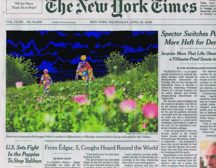 It seems to me, however, that he addresses that same concern in a variety of ways besides the geometric. Indeed, I have noticed another subgroup of pieces we might label, for purposes of shorthand, Sorrows and Victims. For starters, as mentioned earlier, there is that version of the Baghdad hospital with its arabesque of vines and flowers (Sep. 15, 2005 #2). But then as well there is the startling image of an American soldier diving for cover during an ambush in Afghanistan (Apr. 20, 2009), and, soon after, the haunting apparition of two American soldiers bejeweled in flowers as they amble peaceably across a poppy field just moments before another ambush (Apr. 29, 2009).