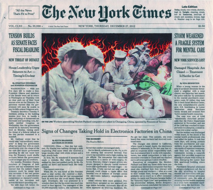 “‘Signs of Changes Taking Hold in Electronics Factories in China.’ Yeah, it’s an assembly line of women working in an electronics plant in China. But they were dressed in white smocks that very much reminded me of doctors’ outfits. And I started thinking about the ramifications of globalization in general. This idea of cheap outsourced labor coupled with the fact of endless war to achieve resource domination. I guess I wanted to conflate the two: Instead of them making iPhones or whatever they were doing in the original photograph, I thought I’d have them operating on this pile of victims of various geopolitical conflicts. Those are actually Iraqi war victims. Not that China has much to do with Iraq, but they all seem to be symptomatic of a global corporate takeover of the world, and the wider idea of cheap labor and endless warfare as the props undergirding other people’s—which is to say our own—material prosperity. The idea of the grime and the suffering that brings us these beautiful streamlined products.”