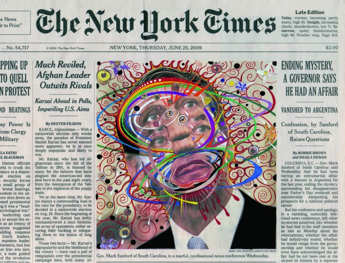 “Indeed. For one thing, there’s the Horror of the Bernies, since a few years later we got the other one: Madoff [Dec. 18, 2008]. And there’s South Carolina governor Mark Sanford, who had to resign when he was caught having absconded to Argentina with his mistress when he’d claimed to have been out hiking the Appalachian Trail [June 25, 2009]. He had such a long face to begin with, and eventually I just decided to keep stretching it. I was having fun at his expense, too. Often, though, I’m just goofing around and playing with stuff until I get what I didn’t know I wanted. It’s through experimenting with media and just playing around that I end up finding my way. It’s like: ‘Oh, wow, I had no idea this is the thing I wanted to make, this is the thing I wanted to see.’ ”