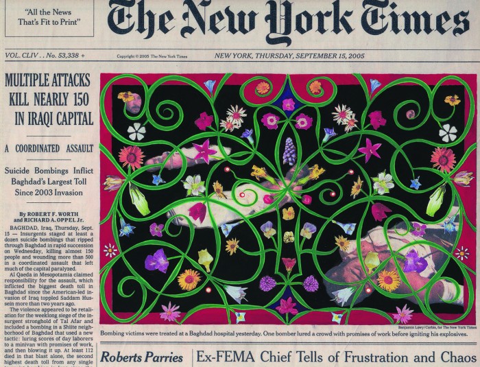 Indeed, one of the very next ones—bombing victims laid out in a Baghdad hospital (Sep. 15, 2005 #2)—was again entirely different in tone: more ornate, “oriental” in its overlay of looping vines and collaged flowers.